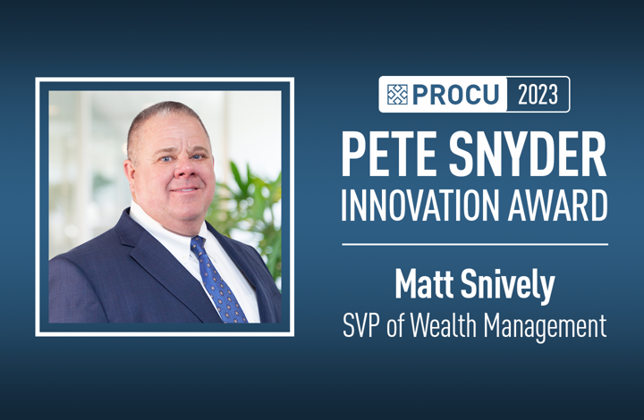 PROCU recently awarded a national honor, the Pete Snyder Innovation Award, to Matt Snively. This recognition is presented each year to an individual who has shown determination in bringing new ideas, new insights, or new technologies to life within their program. Snively was one of six candidates nominated for their commitment to innovation within the financial services industry.