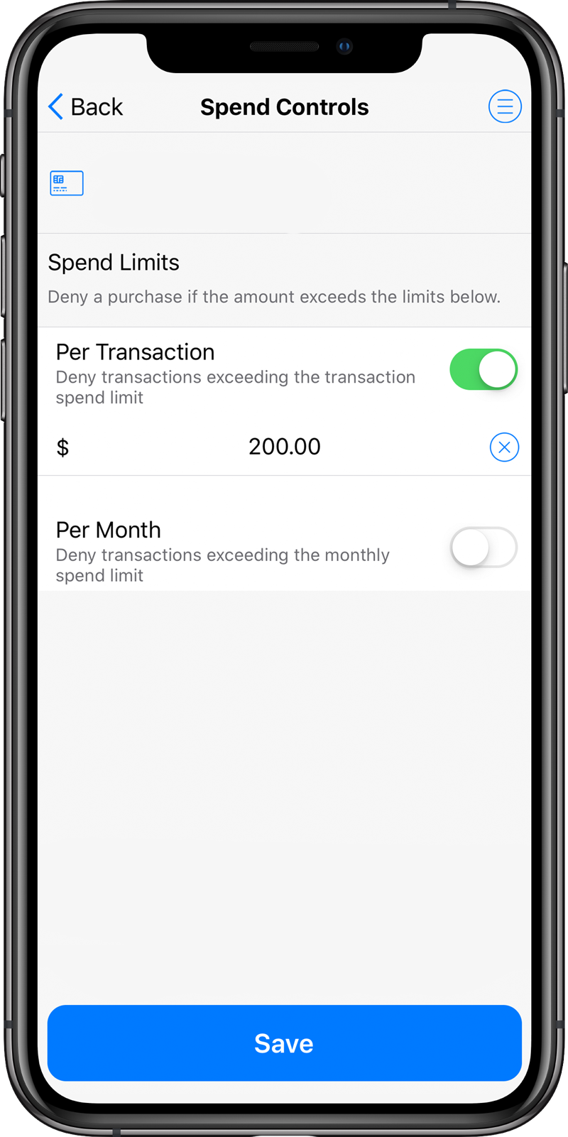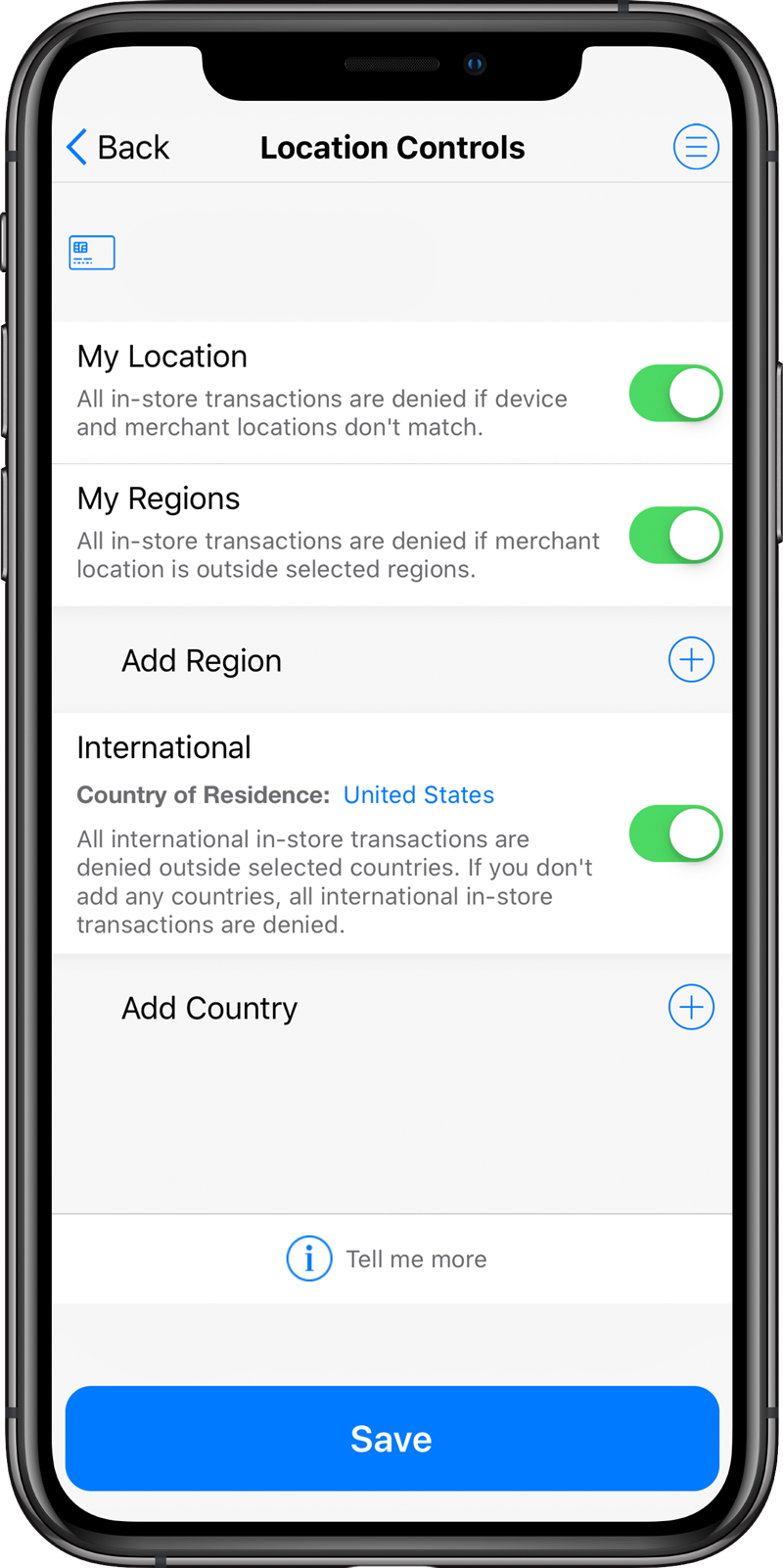• Prevent fraudulent activity by setting controls on transaction types, locations, and merchant types where your card can be used