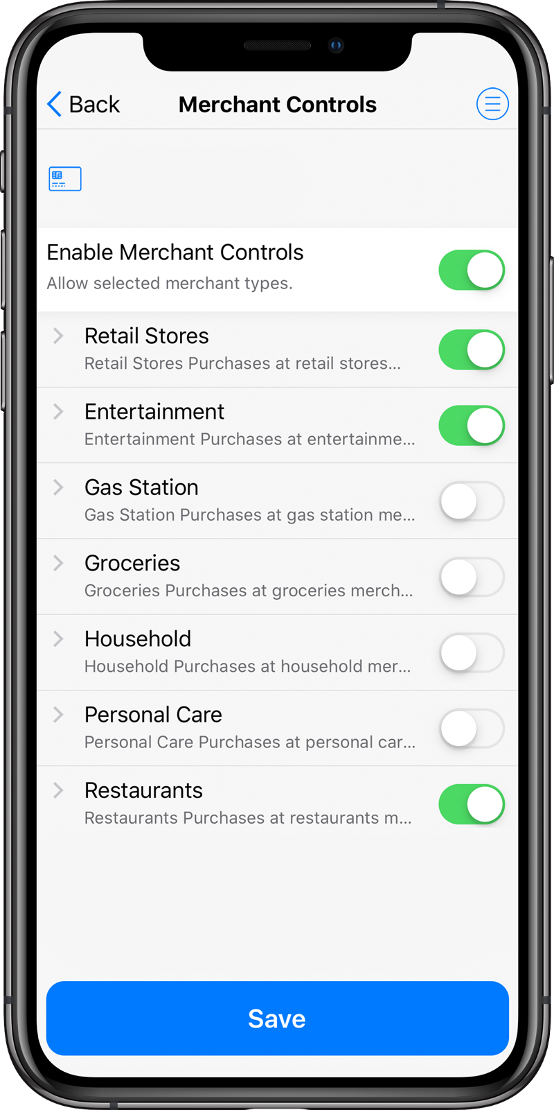 • Merchant Categories - Allow spending at specific merchant categories when you need them and turn them off just as easily. Use merchant alerts to receive a notification when your Elements credit or debit cards are used at specific merchant types like retail stores, gas stations, grocery stores, restaurants, etc.