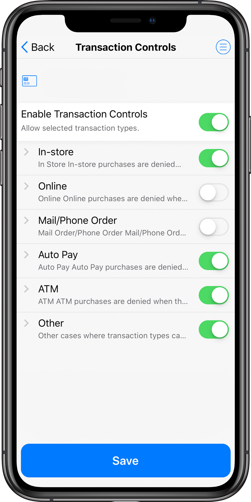 • Transaction Types - Manage the types of debit card transactions allowed on your cards. Use transaction type controls to allow or deny transactions for specific transaction types, such as in-store, online, mail/phone order, auto pay, and ATM.