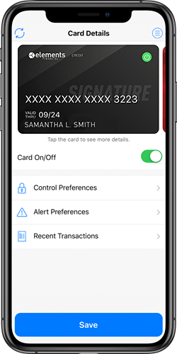 Card Control is a companion app to our Online Banking app that allows you to control when, where, and how your Elements credit and debit cards are used. Instantly turn them off and on, set controls on usage, and establish alerts for a variety of card activities.