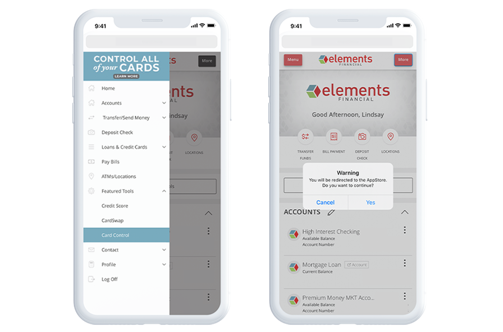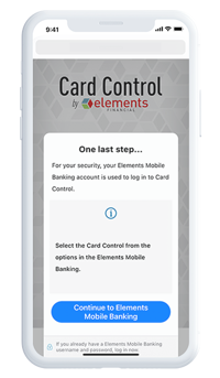 Tap the app icon on your phone to open the Card Control app. When you open the app, you will see a screen (pictured above right) that prompts you to “Continue to Elements Mobile Banking.“ Click that button.